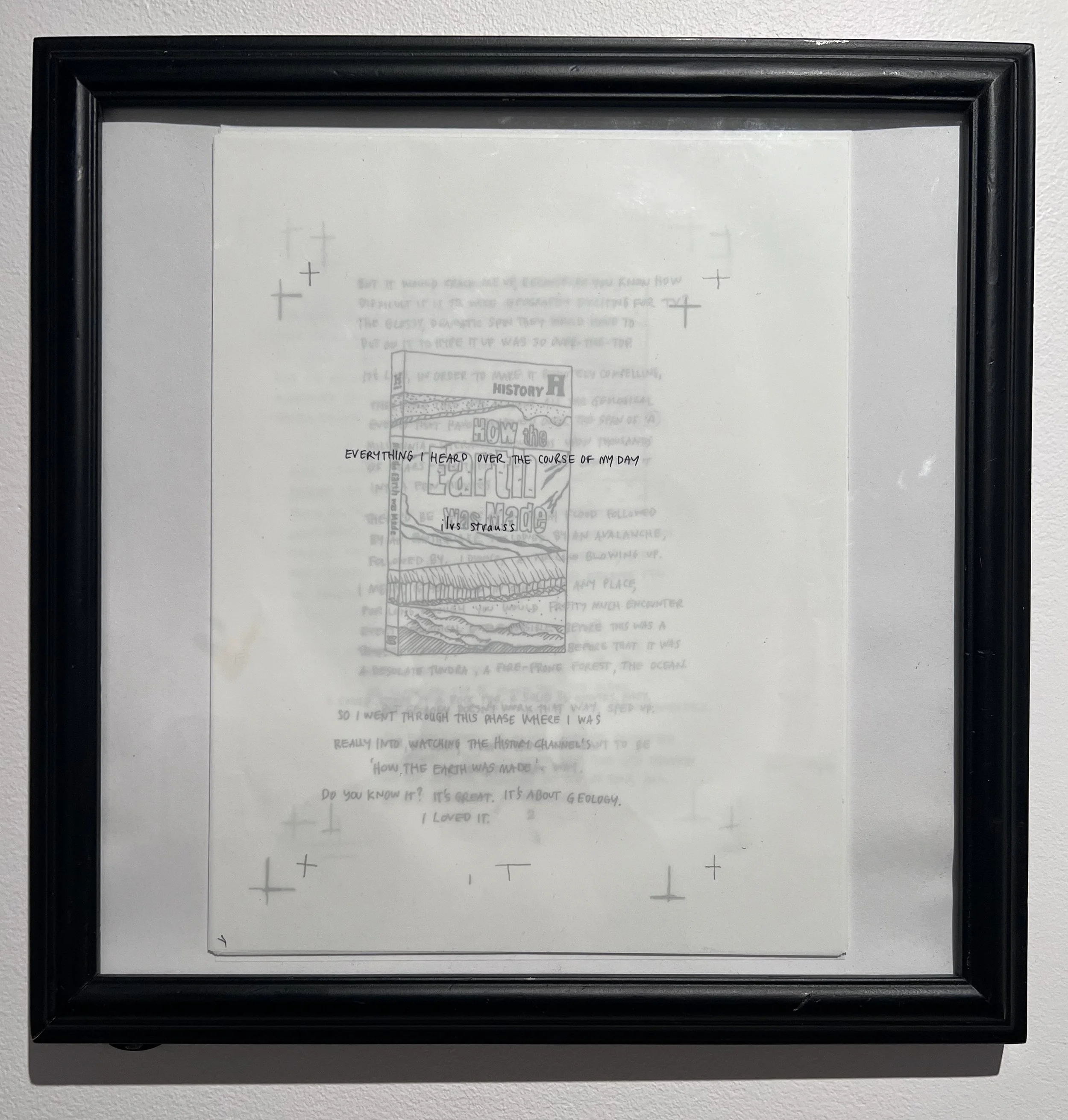 This is the entirety of my zine, EVERYTHING I HEARD OVER THE COURSE OF MY DAY, stacked and framed.