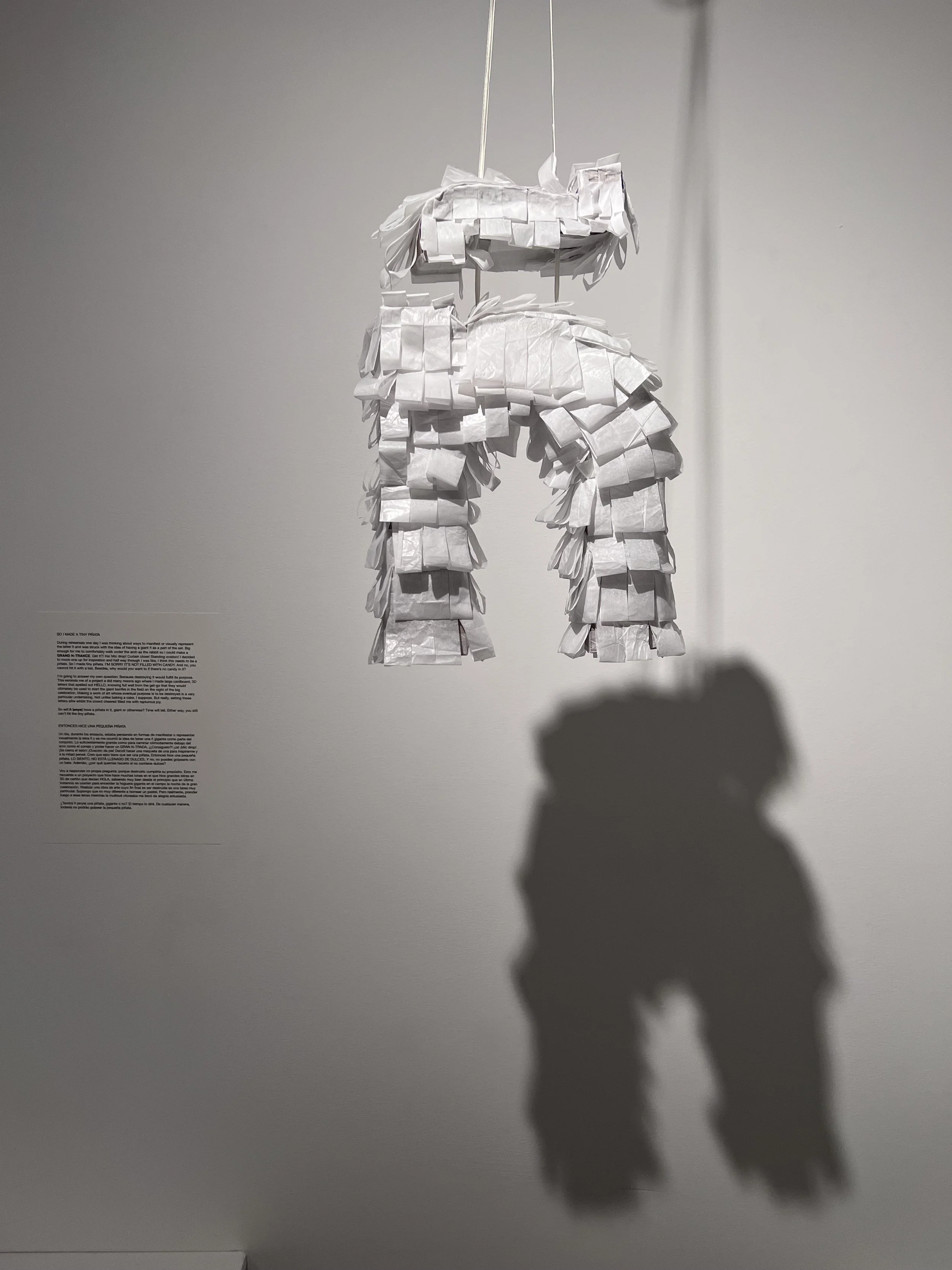 During rehearsals one day I was thinking about ways to manifest or visually represent the letter ñ and was struck with the idea of having a giant ñ as a part of the set. Big enough for me to comfortably walk under the arch as the rabbit so I could make a GRAND N-TRANCE. Get it?! Ha! Mic drop! Curtain close! Standing ovation! I decided to mock one up for inspiration and half way through I was like, I think this needs to be a piñata. So I made tiny piñata. I’M SORRY IT’S NOT FILLED WITH CANDY. And no, you cannot hit it with a bat. Besides, why would you want to if there’s no candy in it?